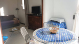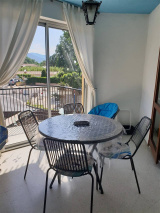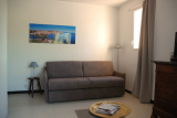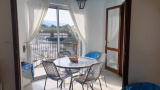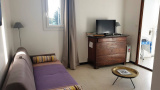 Séjour : Canapé convertible en 160 cm, TV, loggia vitrée avec accès au balcon, table pour 4 personnes et vue dégagée