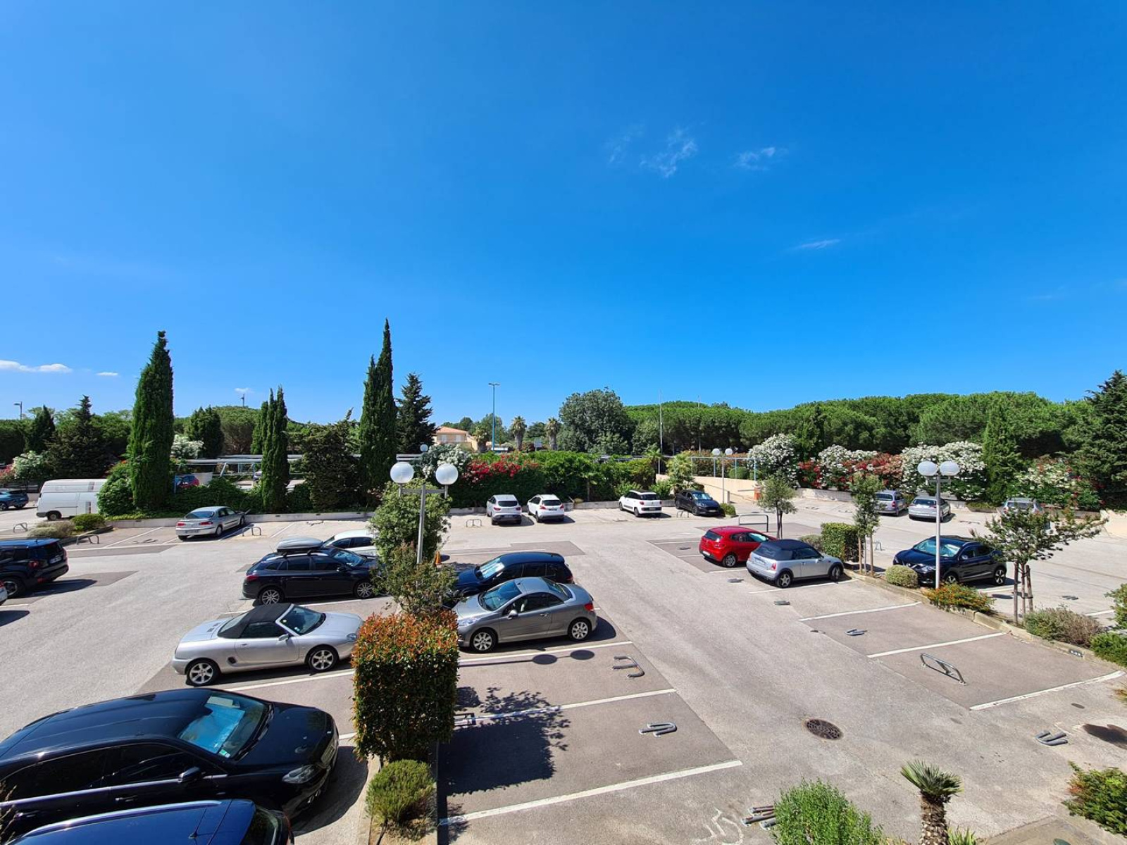 Séjour avec canapé lit, tv, donnant sur balcon avec vue sur le parking et la mer.