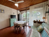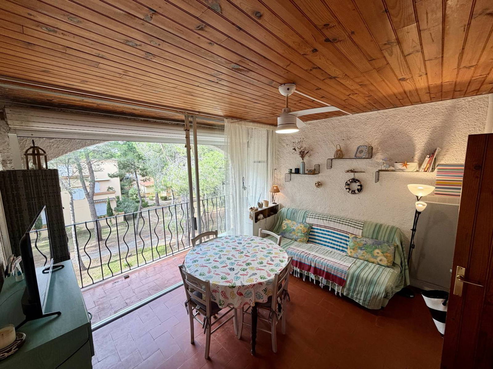 Un séjour lumineux avec coin repas et espace salon, donnant sur un joli balcon avec vue sur la pinède