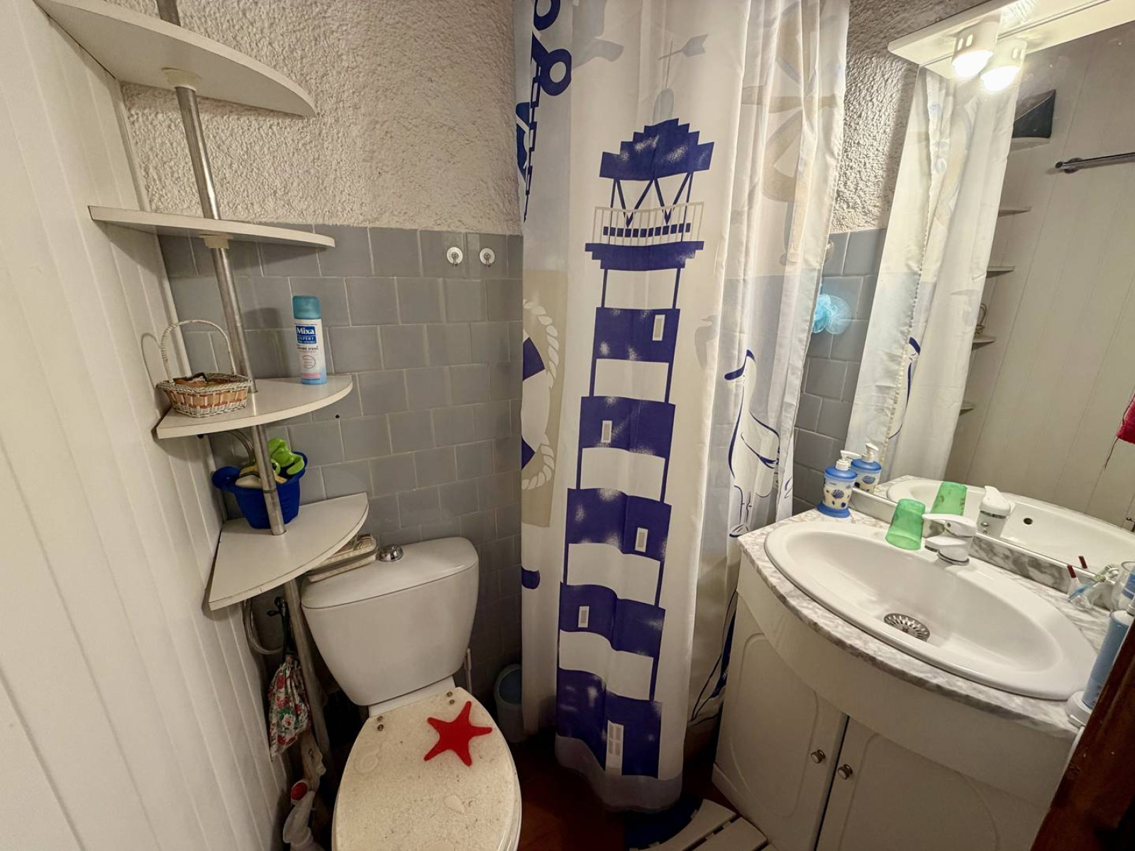 Une salle d’eau avec douche, vasque et WC