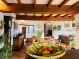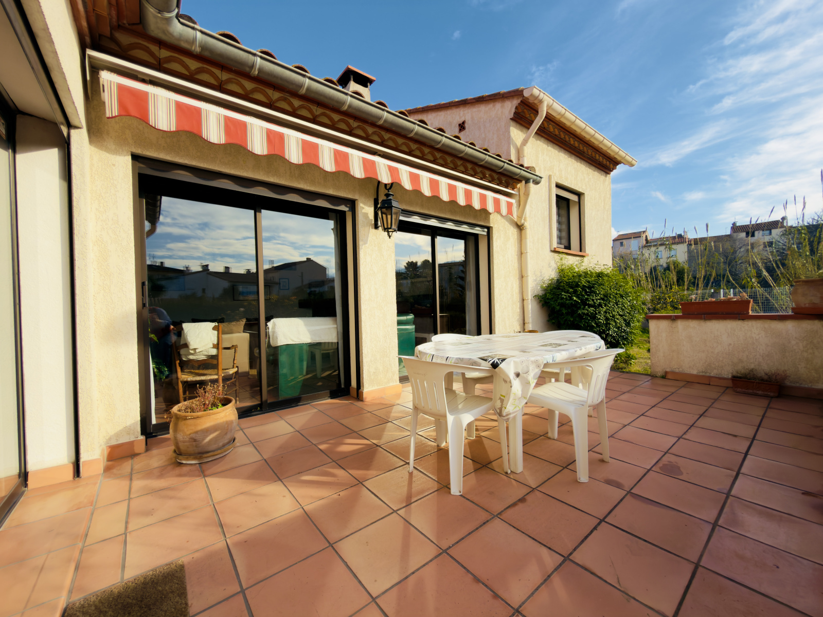 De plus elle comporte certaines prestations comme la climatisation réversible, une cheminée, des stores banes électrique, deux portes de garage motorisées, double vitrage, store roulant électrique, …