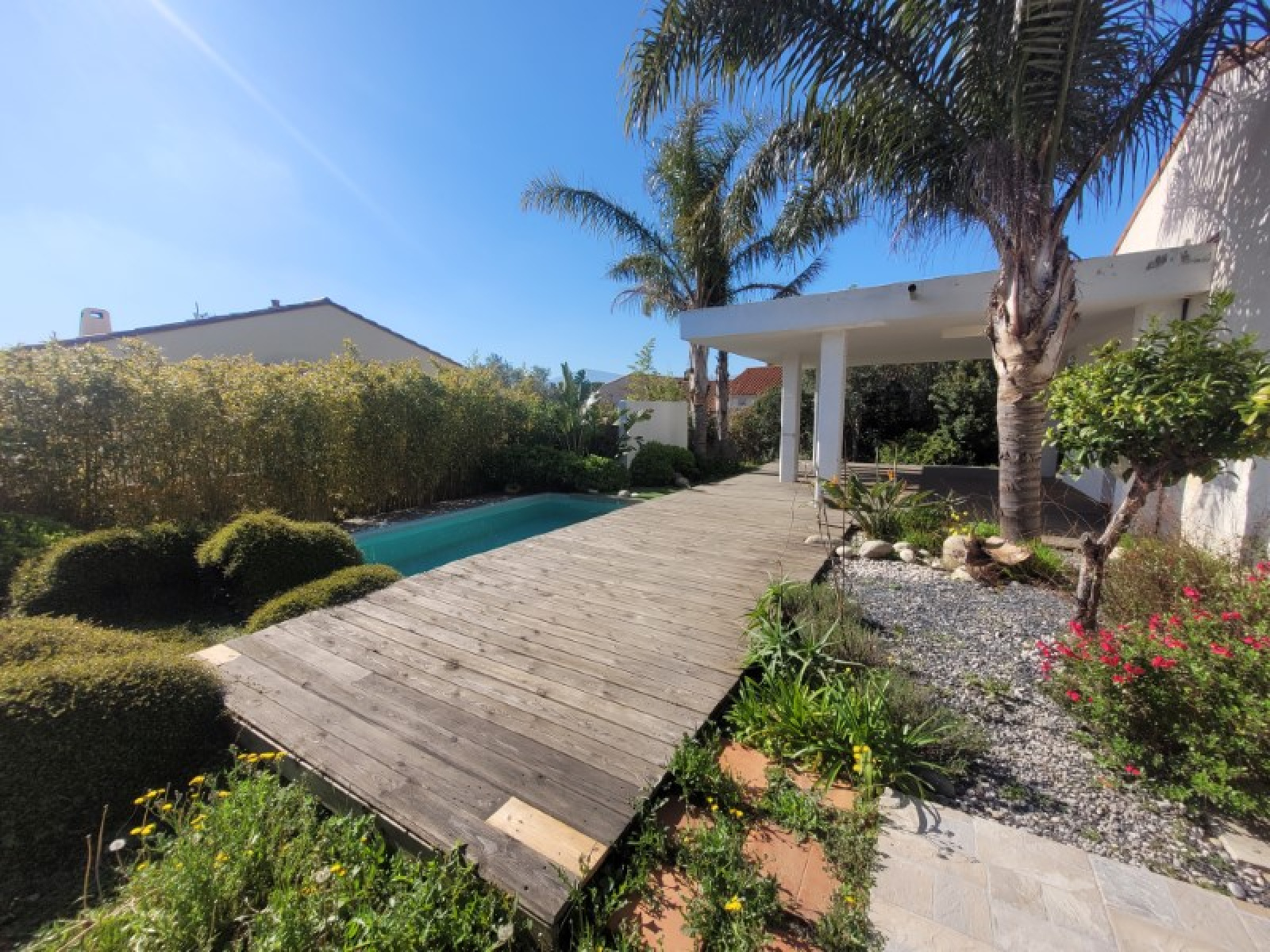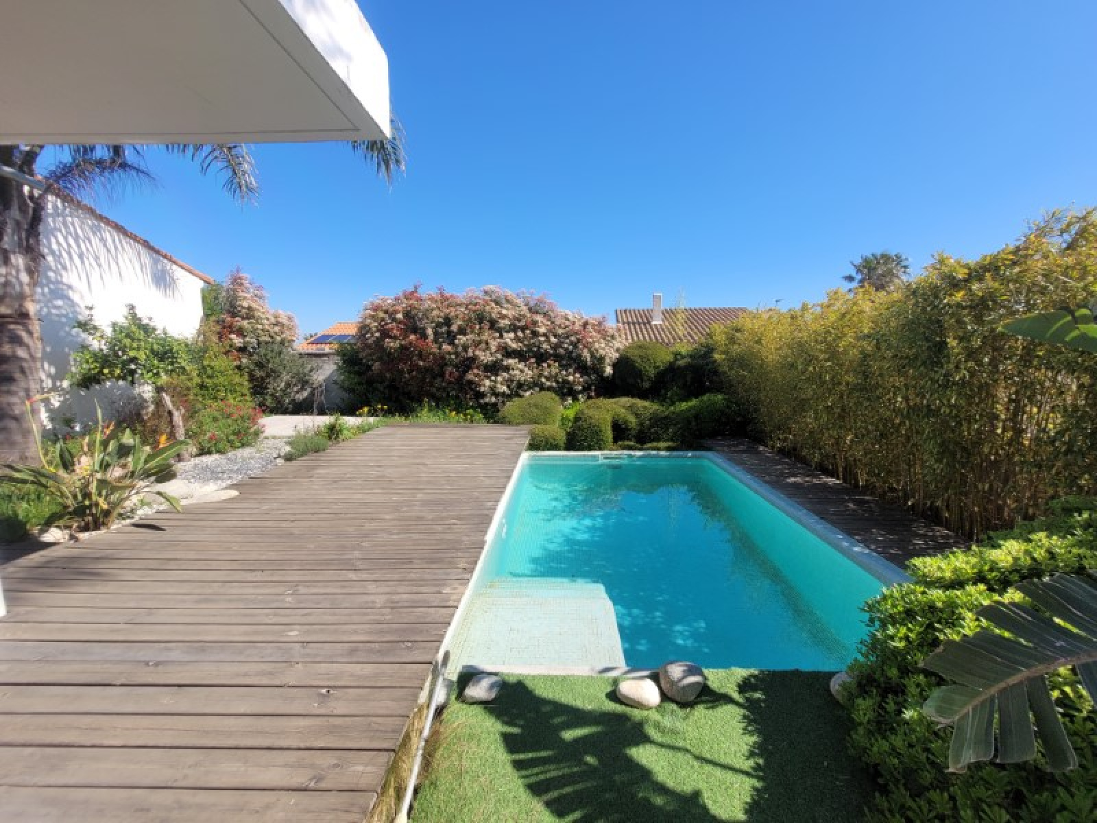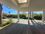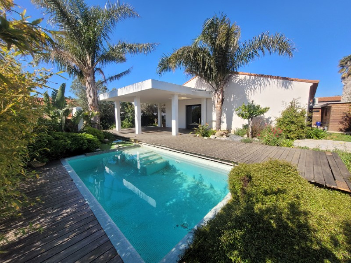 Résidentiel calme, sur 618m² de jardin paysagé sans vis-à-vis, Villa 4 Faces, de 1999, 102m² sh composée d'une entrée, séjour-salon-cuisine équipée ouverte 52m² avec sortie sur le jardin par une large baie vitrée à galandage, 3 chambres, salle d'eau douche à l'italienne, 2 wc. Climatisation dans le séjour et deux chambres, volets roulants. Garage double 34m² avec porte électrique, atelier. Belle terrasse couverte, Piscine maçonnée, coin barbecue four à pizza. Puits. Belles prestations.